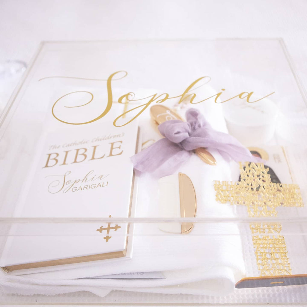 We generally only print first name on the lid. If you wish to add surname and/or mini cross, please indicate this in the cart notes before checking out.